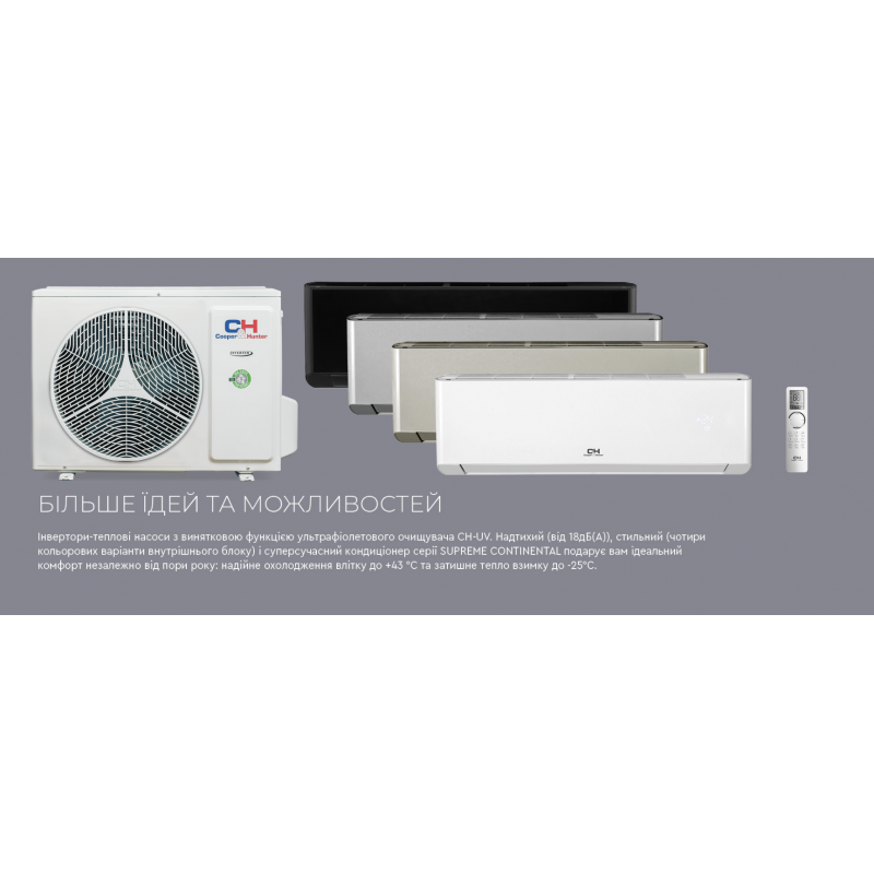 Кондиціонер Cooper&Hunter CH-S09FTXAL2-FB Supreme Continental – оновлена в 2023 році дизайнерська серія теплових насосів. Ця спліт-система об'єднала у собі всі найкращі розробки та технології Купер Хантер за останні роки. Дизайн внутрішнього блоку інженери зробили як у серії Supreme, випущеної раніше, а внутрішня комплектація і функціонал як у серії Arctic. Кондиціонер працює на екологічному озонобезпечному фреоні R32 і може експлуатуватися в широкому діапазоні зовнішніх температур від -25 до +50°С. Це можливо завдяки підвищеному ресурсу роботи та захисту зовнішнього блоку від зледеніння. Кондиціонер CH-S09FTXAL2-FB призначений для встановлення у приміщеннях до 25 м².