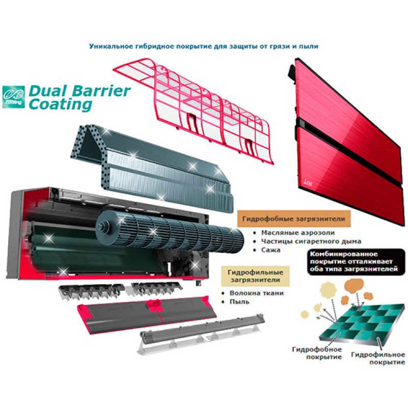 - Складна система жалюзі створює оптимальну форму та швидкість повітряного струменя в режимах охолодження та нагріву. роздільне керування повітряними заслінками забезпечує широке охоплення приміщення, а також комфортні умови одночасно для кількох користувачів.