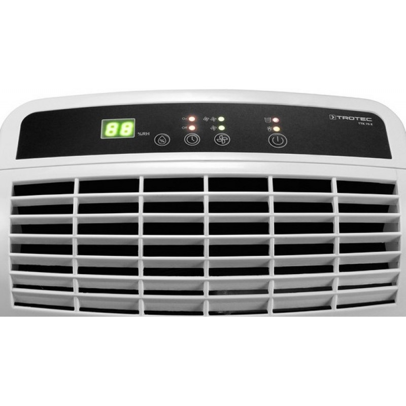 Trotec ТТК 75 E простий в управлінні. Для нього передбачені найбільш оптимальні режими роботи з налаштуванням необхідного рівня вологості, з вибором однієї з двох швидкостей вентилятора та можливістю налаштування роботи за таймером. Панель керування з кількома сенсорними кнопками та сегментним індикатором дисплея дозволяє легко вибрати потрібний режим: