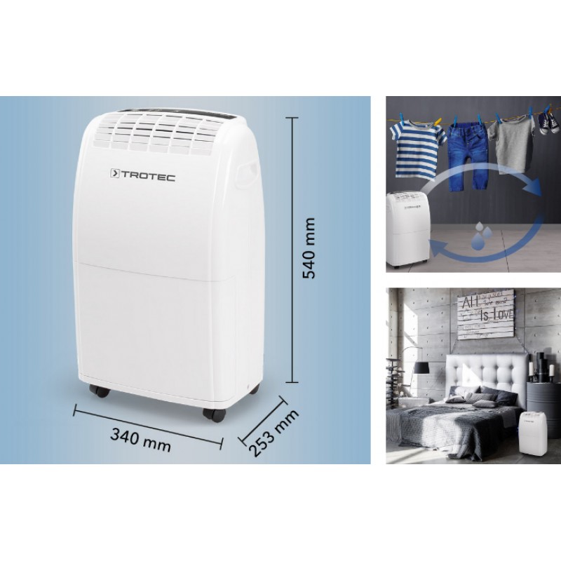 Залежно від температури і відносної вологості повітря вода, що конденсує, постійно або періодично капає у ванну конденсату і через зливний патрубок виводиться в розташовану під нею ємність. У ньому для вимірювання рівня є поплавець. Для керування та контролю функціонування побутові осушувачі TROTEC має табло керування.