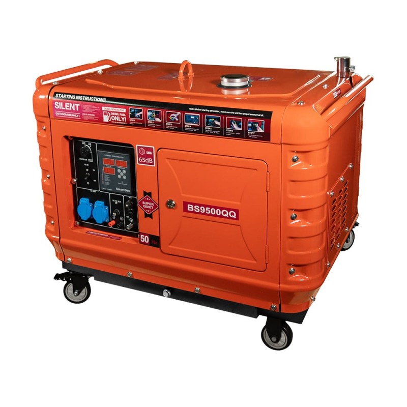 Генератор дизельний; номінальна потужність 5.5 кВт; максимальна потужність 6 кВт; однофазний; вихідна напруга 220 В; 2 розетки 220 В; тип запуску: електричний стартер, роз’єм для підключення автоматичного введення резерву (ATS); супер тихий корпус до 65 дБ. Двигун: одноциліндровий, вертикальний, чотиритактний дизельний двигун з повітряним охолодженням, об'ємом 499 см.куб.; об'єм паливного бака 14.5 л; об'єм мастила в картері 1.65 л; максимальні витрати палива 2.2 л/год; повітряне охолодження; вбудований контролер; тип палива дизель. Розміри 994 / 642 / 750 мм, вага 210 кг